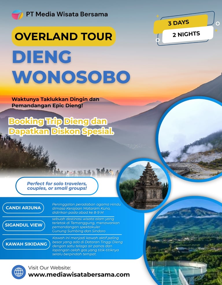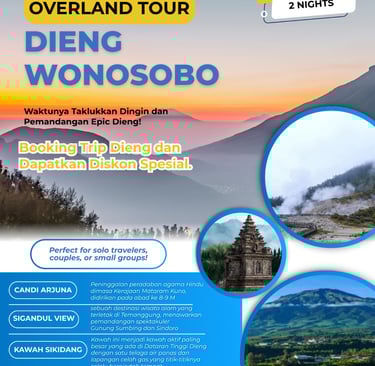 Wisata Dieng menawarkan keindahan alam pegunungan vulkanik aktif dengan suhu sejuk Tempat ini juga dikenal sebagai "negeri di atas awan" karena hamparan lautan awan yang bisa dinikmati dari puncak-puncak tingginya