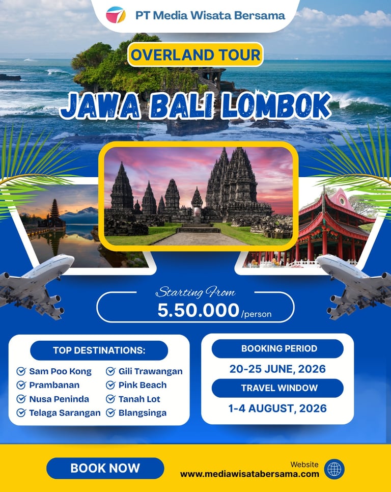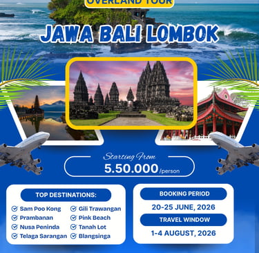 Jelajahi keajaiban tiga pulau terpopuler: Jawa, Bali, dan Lombok!" Rasakan sensasi berbeda dalam satu perjalanan. Mulai dari pesona budaya dan megahnya Candi Borobudur di Jawa, relaksasi di pantai-pantai eksotis Bali, hingga petualangan alam yang menantang di Lombok. Petualangan yang lengkap, hanya untuk Anda.